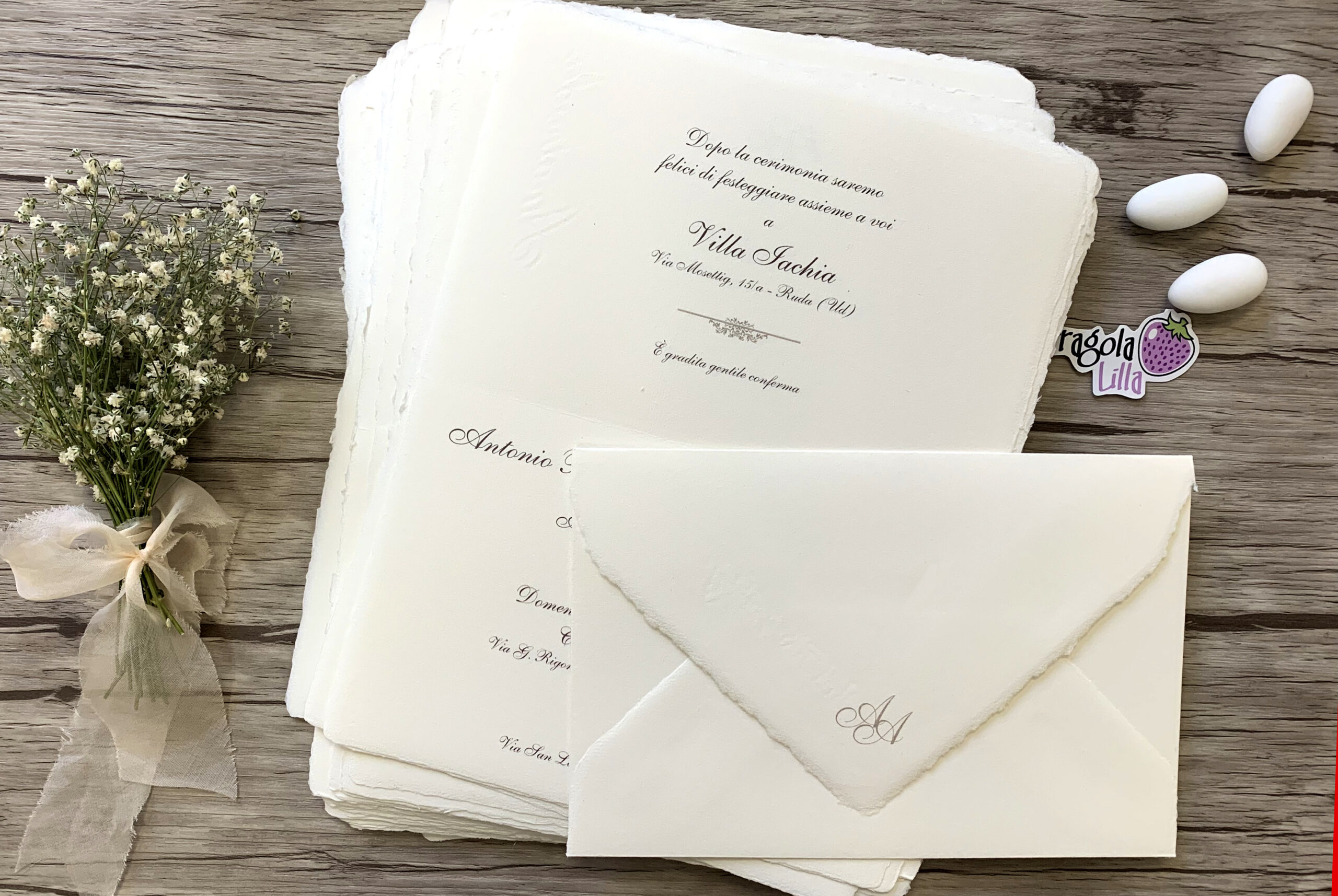 Partecipazione in cartoncino singolo o piegato a metà in carta artigianale Amalfi, formato rettangolare 11x17cm, compresa busta bianca Amalfi 12x18cm.