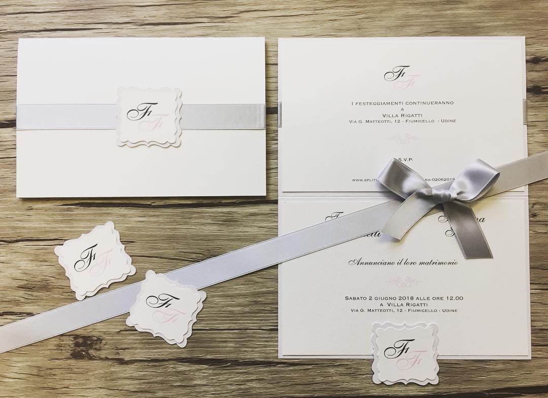 Partecipazione formato piegato a metà, rettangolare 11x17cm o quadrata 16x16cm, compresa busta bianca standard 12x18cm o 17x17cm. Cartoncini applicati, nastro e applicazione sagomata in copertina, senza bigliettini aggiuntivi.