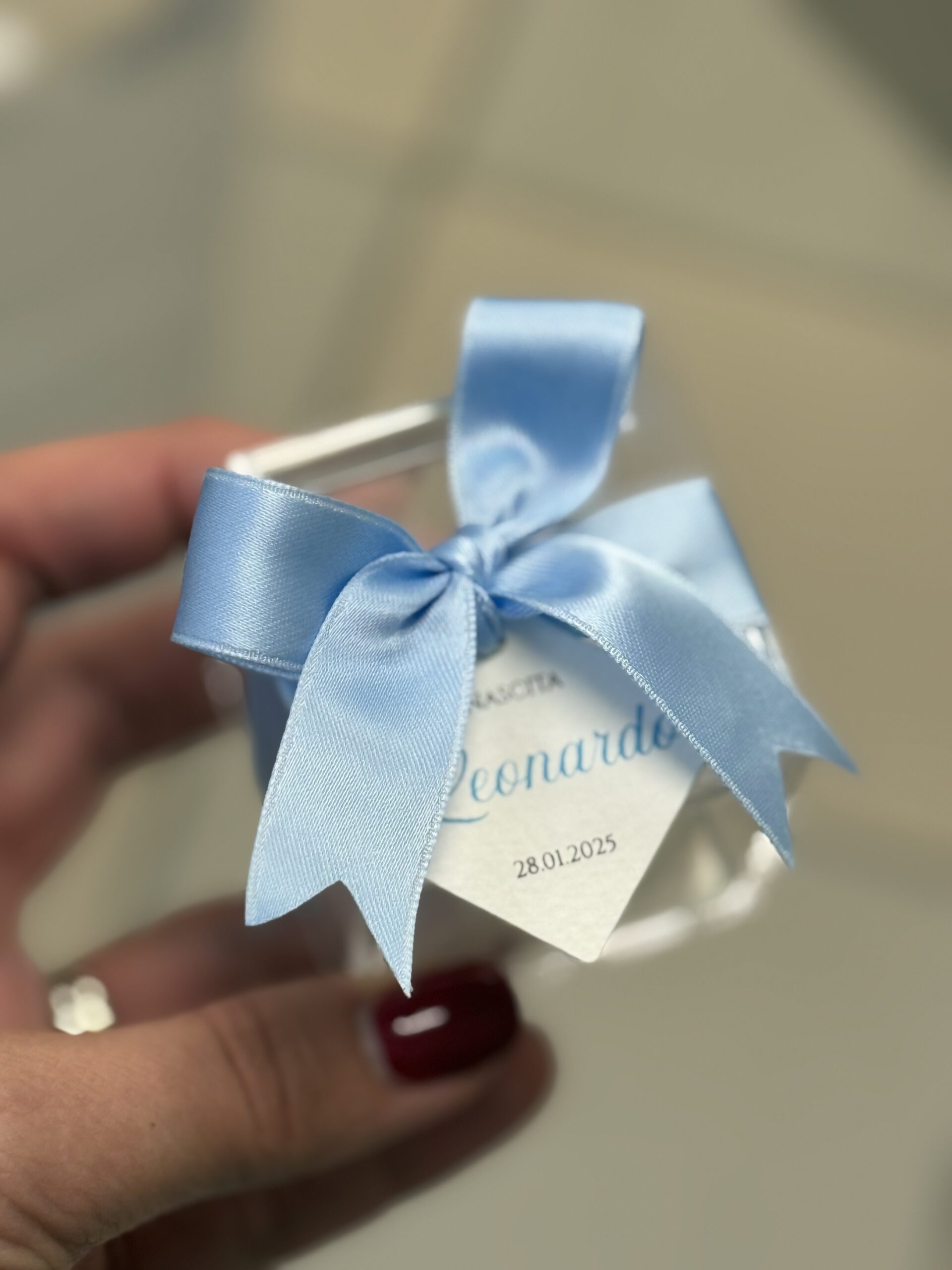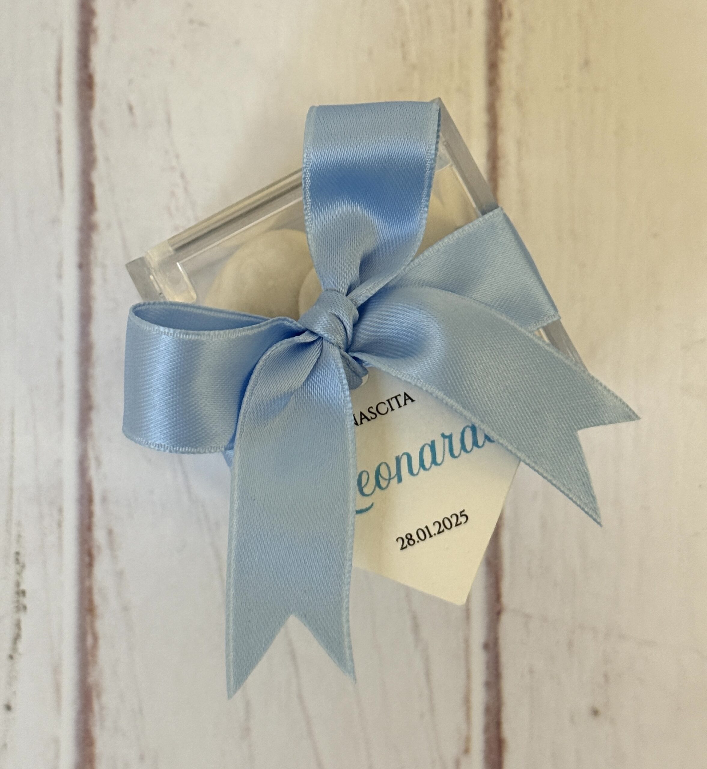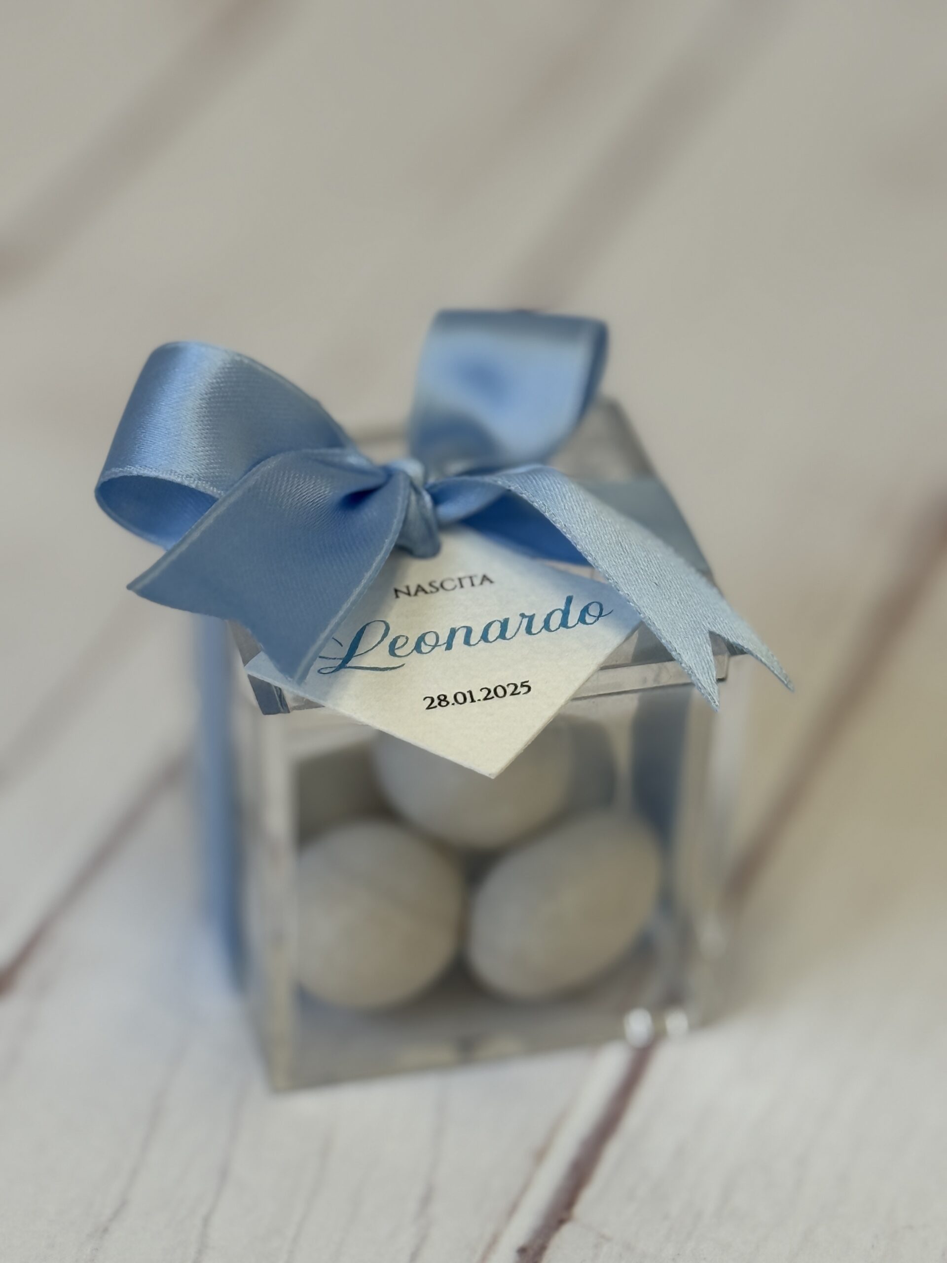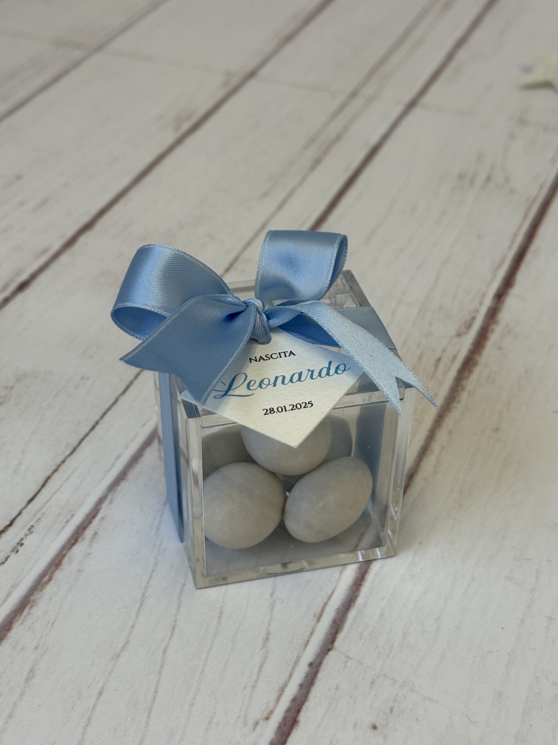 Bomboniera scatolina in plexiglass 5x5x5cm, completa di confetti bianchi (a scelta tra cioccolato – mandorla – cioccomandorla), bigliettino (con grafica personalizzata a scelta) e nastro (colore a scelta).